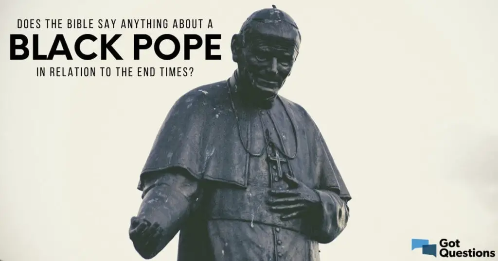 Do ponto de vista bíblico, não há nenhuma conexão entre um “papa negro” e os tempos finais. A Bíblia jamais menciona a papabilidade. A ideia de um líder supremo para toda a igreja cristã não está presente nas Escrituras. Apocalipse 17:9 poderia ser interpretado como uma profecia sobre a cidade de Roma, já que esta é conhecida como a “Cidade das Sete Colinas”. Alguns interpretam a Babilônia de Apocalipse 17, assim como a prostituta que monta a besta, como a Igreja Católica Romana. Essa interpretação leva alguns a acreditar que, nos tempos finais, a Igreja Católica Romana, liderada por um papa apóstata, dará as boas-vindas à vinda do Anticristo. No entanto, a Bíblia não diz nada a respeito de papas em geral ou de um papa dos tempos finais em particular.