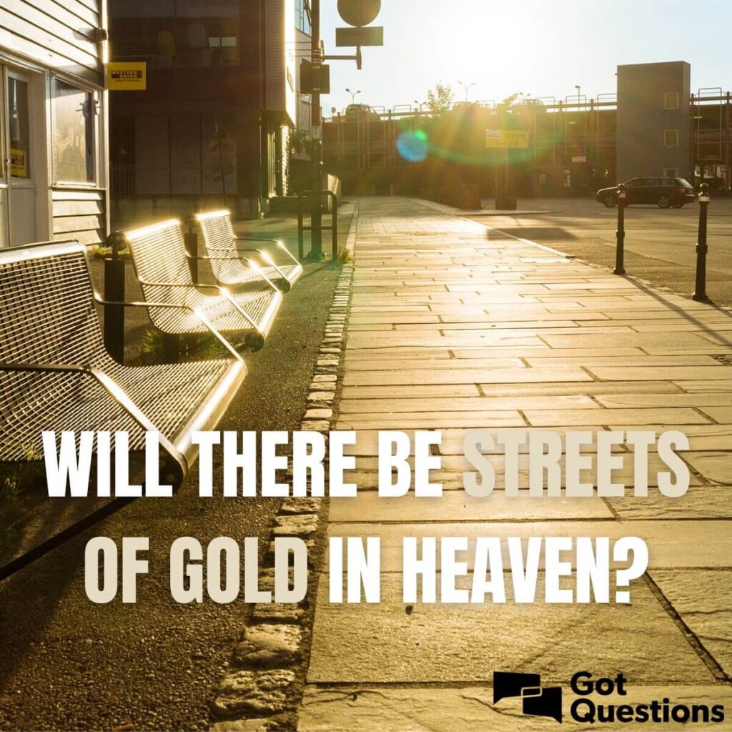 A palavra grega traduzida por “ouro” em Apocalipse 21:21 é chrusion, que pode significar “ouro, joias de ouro ou revestimento”. Traduzir como “ouro” faz pleno sentido. As dificuldades interpretativas surgem ao tentar decidir quais partes da Bíblia levar ao pé da letra e quais devem ser entendidas de forma figurada. Uma boa regra ao estudar as Escrituras é entender tudo literalmente, a não ser que isso não faça sentido. Nesta passagem, não há motivo para pensar que o ouro seja apenas figurativo. João não está apenas usando termos descritivos aleatórios; sua menção a uma rua “de ouro” parece ser para ser entendida de forma literal.
