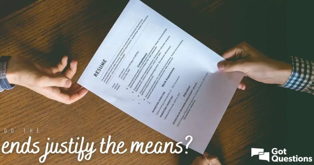 A ideia de “os fins justificam os meios” geralmente envolve a prática de algo errado para alcançar um resultado positivo, justificando o erro com um desfecho benéfico. Um exemplo seria mentir em um currículo para conseguir um bom emprego, justificando a mentira ao afirmar que a renda maior permitirá ao mentiroso cuidar melhor de sua família. Outro exemplo seria justificar o aborto de um bebê para salvar a vida da mãe. Tanto mentir quanto tirar uma vida inocente são ações moralmente erradas, mas prover para a família e salvar a vida de uma mulher são intenções moralmente corretas. Mas onde se traça a linha?
