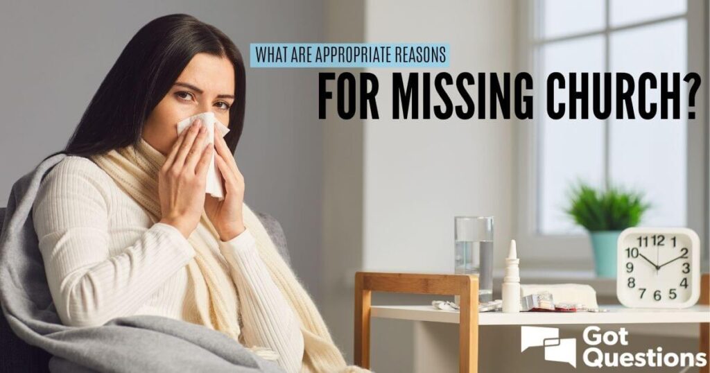 A frequência à igreja deve ser uma prioridade na vida cristã e o compromisso com a igreja local é de suma importância. Mas quais são, então, as razões apropriadas para faltar a um culto? É impossível criar uma lista que se aplique a todas as pessoas. Certamente, é aceitável faltar à igreja em casos de doença. Em outras circunstâncias, tudo se resume à motivação e à atitude: se o motivo para a ausência é servir melhor ao Senhor em outro lugar, atender a uma necessidade verdadeira ou cumprir uma responsabilidade ordenada por Deus, então não há problema em faltar a um culto. Por exemplo, um policial de plantão não pode deixar de atender a um chamado apenas para ocupar um assento no banco da igreja. No entanto, se a ausência se dá para satisfazer desejos carnais, buscar interesses egoístas ou evitar a comunhão cristã, aí sim há um problema.