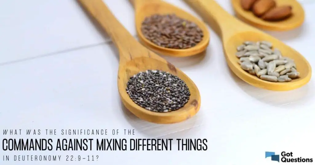 O trecho de Deuteronômio apresenta três mandamentos que proíbem a mistura de diferentes tipos: sementes, animais de tração e fibras têxteis. Cada comando trata da combinação de dois “tipos” distintos – seja no plantio, no trabalho animal ou na confecção de vestimentas. O tema central é a preservação da pureza, tanto no aspecto prático quanto no espiritual.