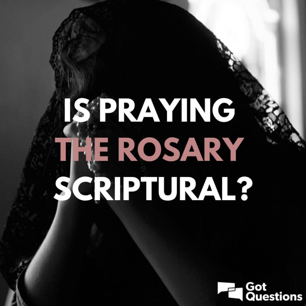A oração do rosário é promovida dentro da Igreja Católica como um meio de fortalecer a fé, resistir ao mal, crescer espiritualmente e beneficiar a sociedade. Embora parte da oração do rosário seja baseada na Escritura, a segunda metade do “Ave Maria” e trechos do “Salve, Rainha” são flagrantemente não bíblicos. Enquanto a primeira parte do Ave Maria é quase uma citação direta de Lucas 1:28, não há base bíblica para (1) orar a Maria, (2) dirigir-se a ela como “santa” ou (3) chamá-la de “nossa vida” e “nossa esperança”.